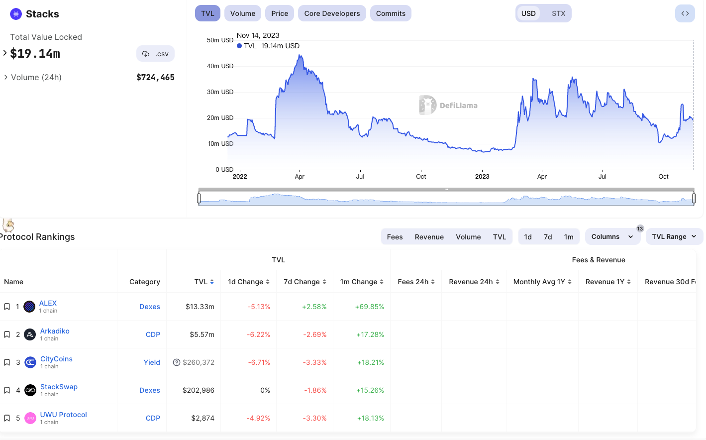 这些 Layer 2 或侧链项目中,推出了原生代币且市值最高的是 Stacks。根据 DefiLlama 数据,目前 Stacks 的 TVL 为 1914 万美元。Stacks 上的 DeFi 项目中,去中心化交易所 ALEX 的 TVL 最高,为 1333 万美元,且过去一个月增加了 69.85% 。