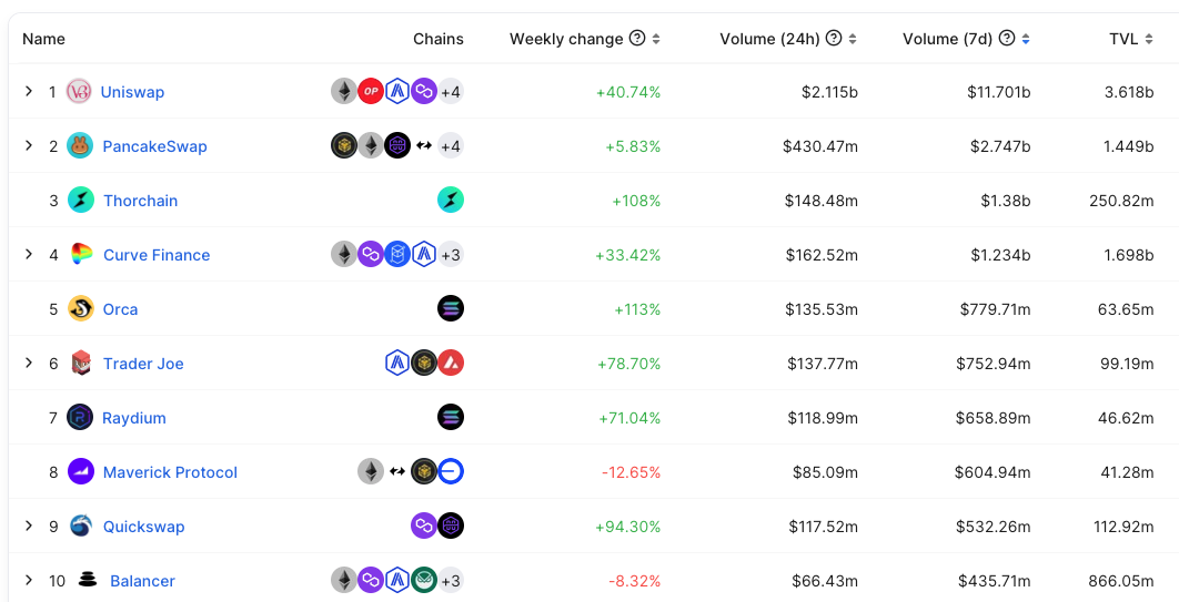 过去 7 天,THORChain 的交易量为 13.8 亿美元,在所有 DEX 中位于第三。目前,THORChain 的 TVL 为 2.5 亿美元,过去一个月上升 106.7% 。它的原生代币 RUNE 也是近期表现最好的资产之一,目前 RUNE 的价格为 4.84 美元,过去 7 天上涨 39.3% 。