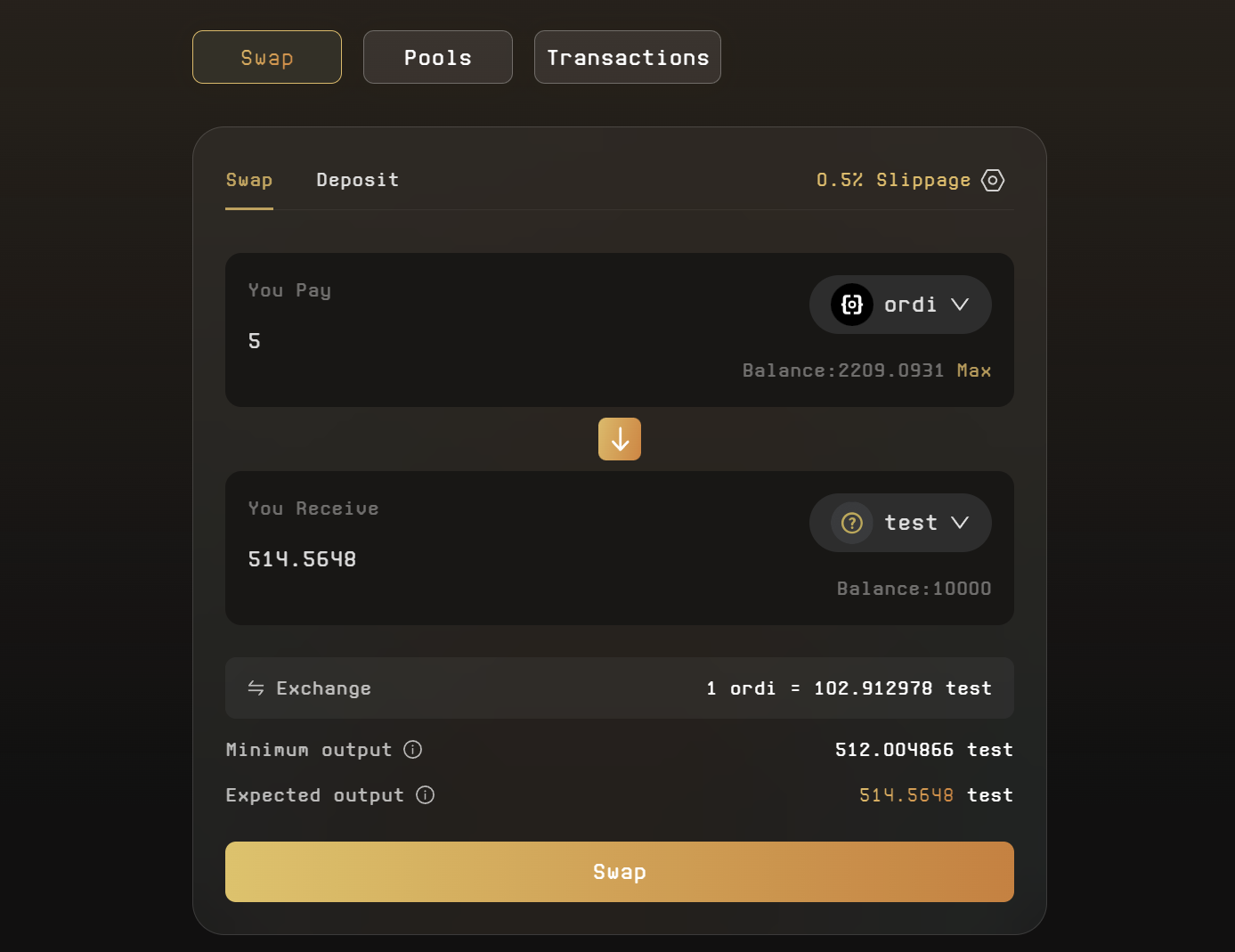 基于 brc-20 协议,Unisats 建立了一种允许用户提供流动性、交易的 brc 20-swap,并声称这是一种在比特币主网上运行且使用 brc 20 协议的首个原生 Ordinals 交易模块。brc 20-swap 实现了自动做市商的功能,同样根据 Uniswap V2等采用的 x * y = k 公式进行交易,手续费为 0.3% ,流动性提供者获得手续费的 5/6 ,剩余 1/6 作为平台费用,手续费以 brc-20 资产 SATS 的形式收取。