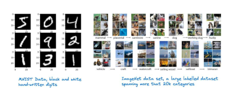 图 29 :两个流行数据集的示意图。MNIST 包含手写数字,而 ImageNet 包含数百万张不同类别的注释图像
