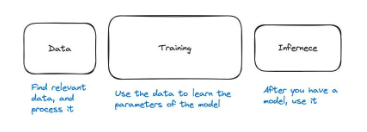 机器学习管道可分为三个主要步骤。有了数据,我们要训练模型,然后有了模型,我们就可以使用它。使用模型称为推理。因此,这三个步骤分别是数据、训练和推理。
