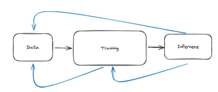 到目前为止,我把这个管道设计成了依次进行的三个步骤。你获取数据,处理数据,清理数据,一切都很顺利,然后你训练模型,模型训练完成后,你进行推理。这就是机器学习在实践中的美好图景。实际上,机器学习需要进行大量的迭代。因此,它不是一个链条,而是如下图所示的几个循环。