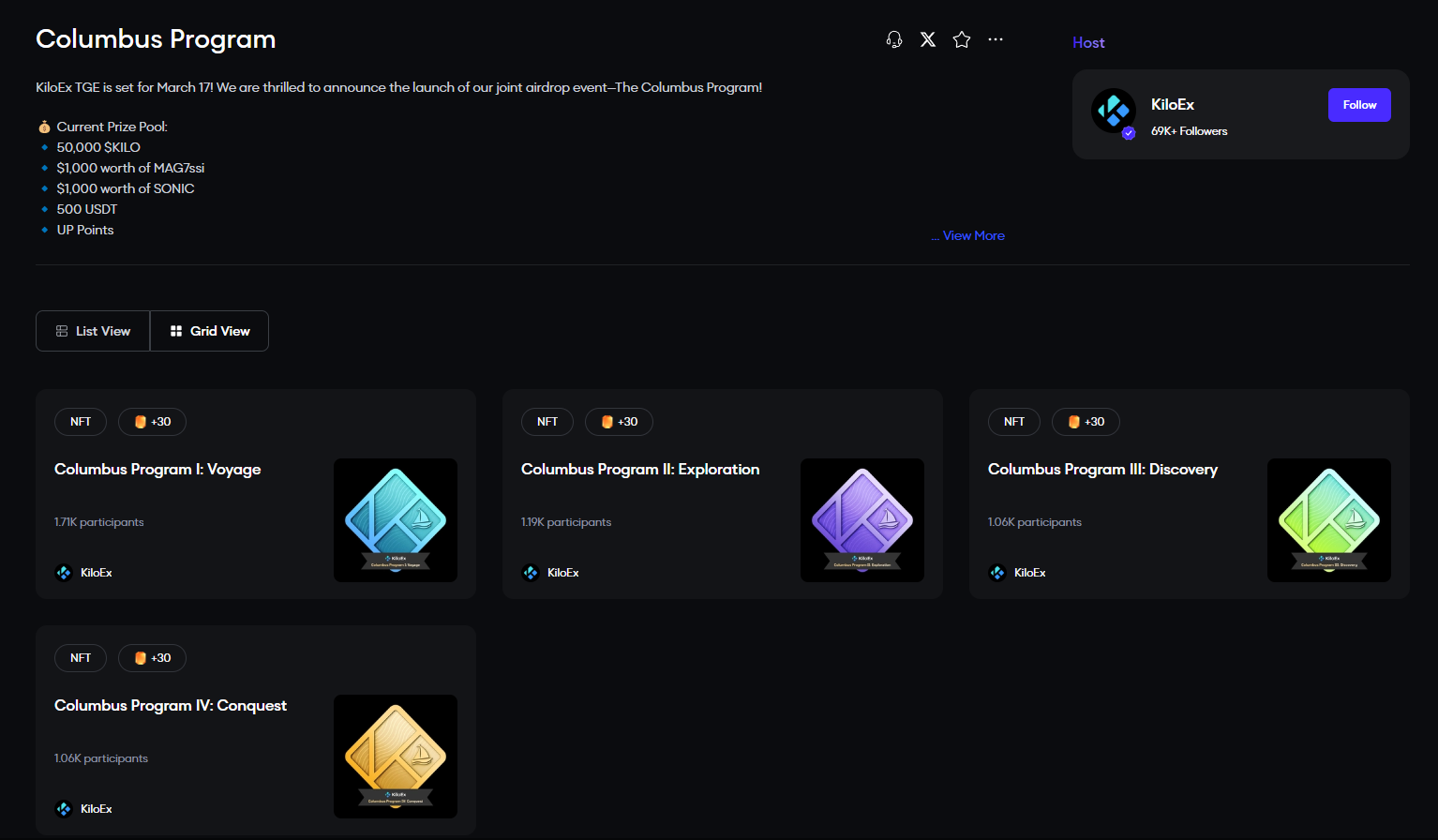 Columbus Program(活动连接:https://app.galxe.com/quest/KiloEx/GCXdxt1YEv):任务共 4 组,分别社交类和交易量任务,相对简单。