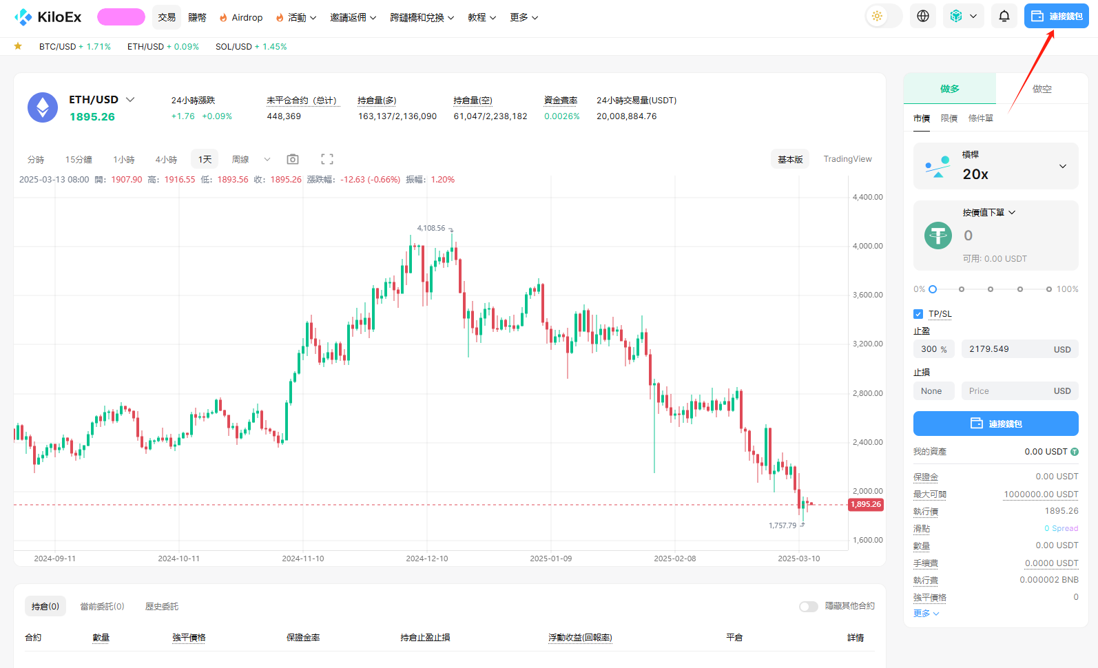 STEP 3. 返回到交易界面,选择“做多/做空”,设置杠杆倍数,设置按价值下单的 USDT 数量(任意数量都行),点击“做多/做空”,然后根据盈亏情况点击“市价/限价”平仓即可。根据官方信息,Kiloex 空投主要是和交易量的大小挂钩,交易量越大,那么空投越多。因此为了获得更多空投需要反复进行交易增加交易量。