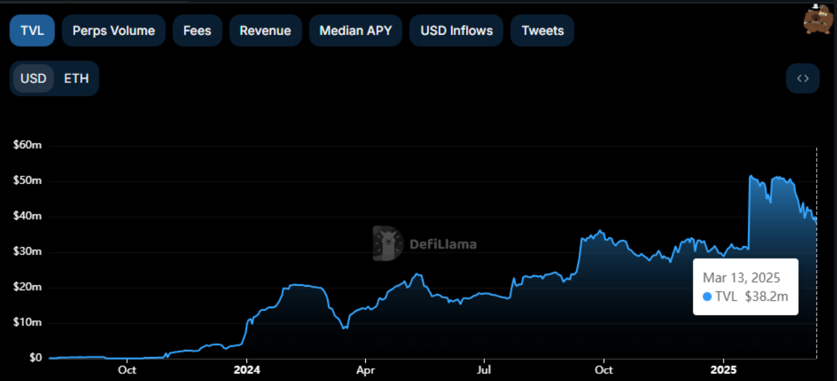 根据官方数据,KiloEx 平台目前未平仓合约价值近 800 万美元,累计用户数近 40 万。此外,根据 DefiLlama 数据,KiloEx TVL 最高触及 5000 万美元,目前有所回落,暂报 3800 万美元。