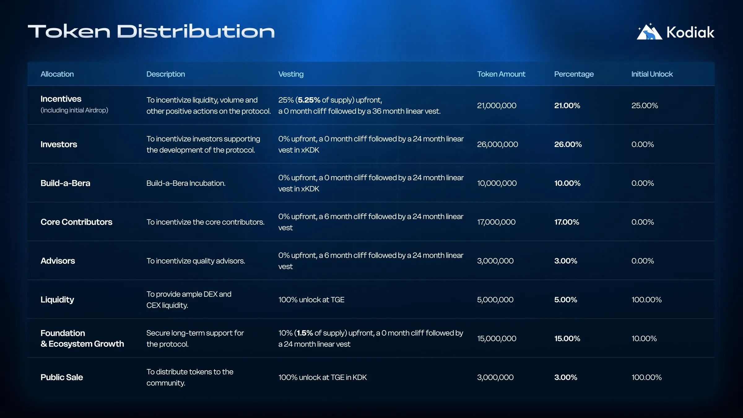 - KDK 是Kodiak生态的原生代币,用于支撑协议激励、治理及长期价值对齐。