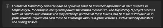 MapleStory N 收到 $NXPC 作为生态贡献奖励,并可能将部分 $NXPC 兑换成 NFT 作为游戏内奖励发放,玩家可以通过包括打怪以及打 Boss 等各种游戏内活动获得 NFT