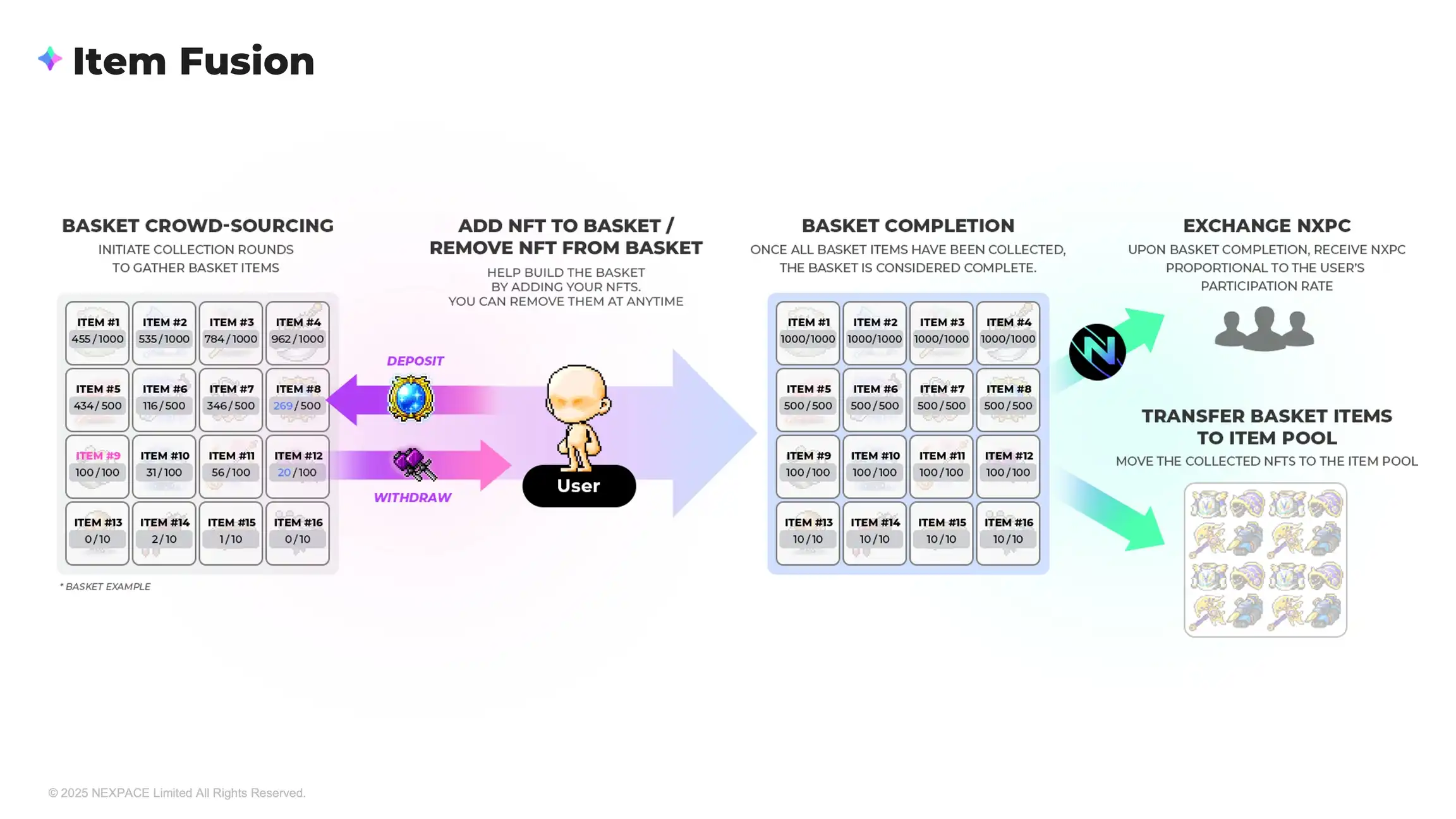 「$NXPC 裂变」机制是指玩家可以使用 $NXPC 兑换游戏道具(NFT)。这个机制很像是 FCFS(先到先得)抢购 NFT 的过程,玩家兑换到的不是某个特定的道具,而是「MSU 物品池」中剩余所有可用道具类型最大供应量的固定百分比。