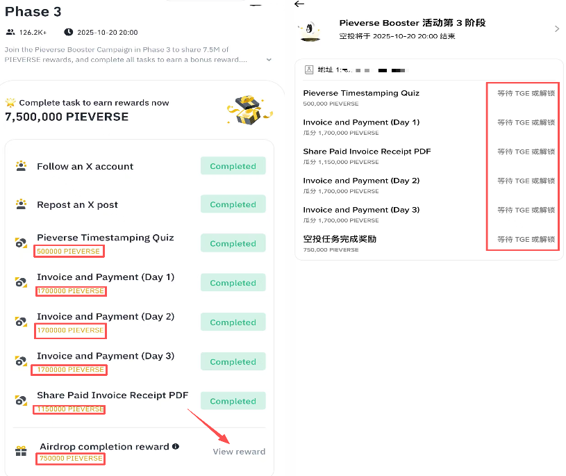 以 Pieverse Booster Program Phase 3 活动为例,下方标有代币数量的任务即为“空投”任务。此外,完成任务后,可点击下图中“View reward”查看任务完成情况与解锁信息。