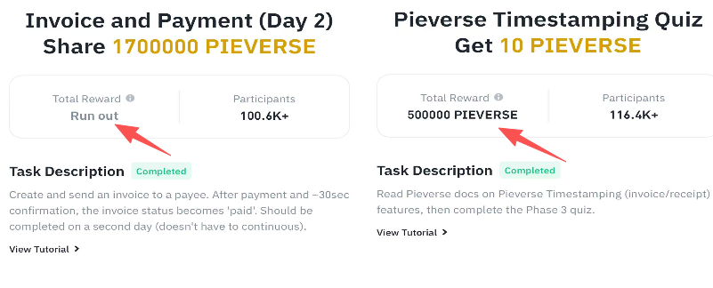 以 Pieverse Booster Program Phase 3 活动为例,点击有代币奖励的任务后,如下图所示,显示“Run out”即为达到上限,若仍显示代币数量即仍可参与赚代币。