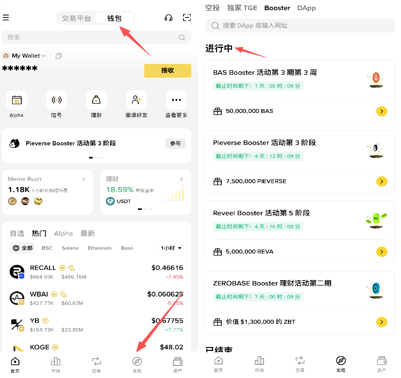 所有符合币安 Alpha 积分要求的币安无私钥钱包用户均可参与加速器币安 Booster 活动,参与活动无需消耗币安 Alpha 积分。具体活动界面入口如下图:打开币安钱包后,点击下方“发现”进入 Booster 活动界面。