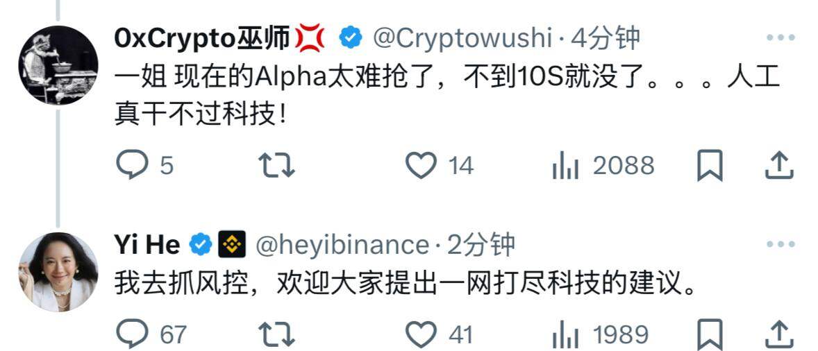但 10 月以来币安 Alpha 的“赚钱效应”远不如 9 月。一方面,币安 Alpha 上出现开盘价值仅有 30 至 50 美元的“先到先得”项目;另一方面,由于大批“工作室”的入场导致币安 Alpha “蹲点”抢空投的难道急速提升。对于前者,最好的应对方式是减少每日交易磨损;而后者,币安官方也在积极想办法解决,何一也在 X 平台表示,“我去抓风控,欢迎大家提出一网打尽科技的建议”。
