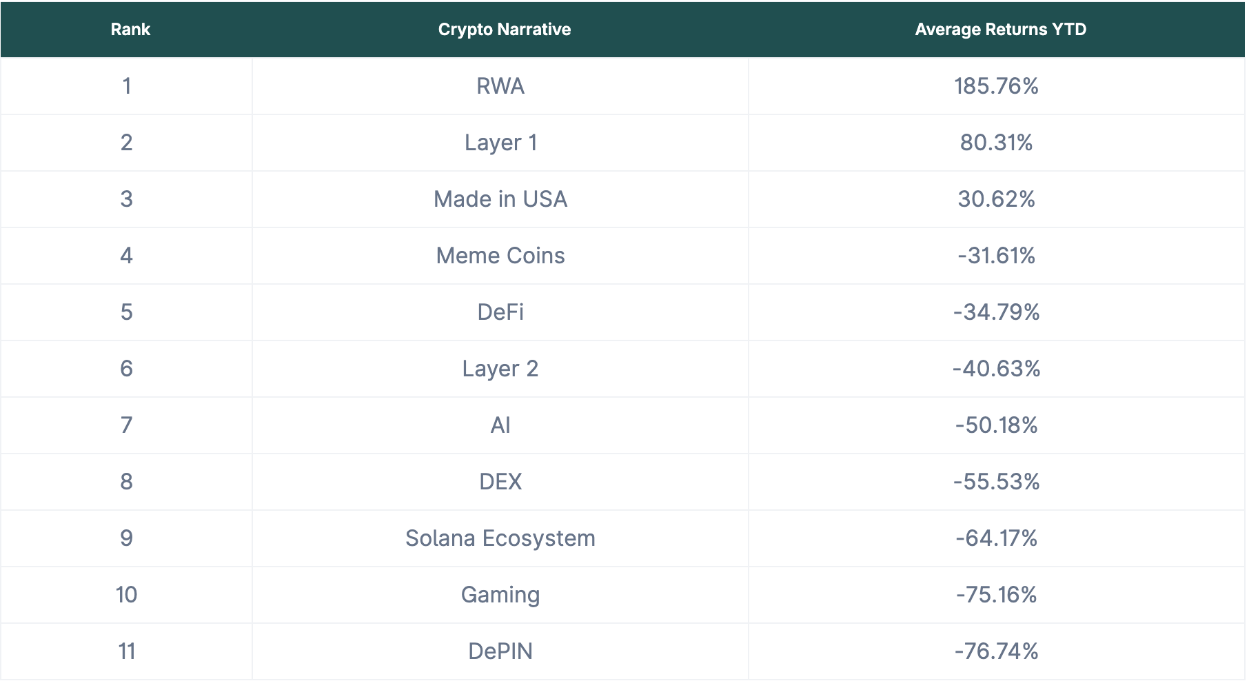 本被寄予厚望的政策红利年,却最终以比特币年线收跌告终,其他加密资产的表现更为惨淡。根据 CoinGecko 数据统计,今年仅有 RWA、Layer1 和美国本土叙事板块录得上涨,其余赛道均为双位数跌幅,市场缺乏赚钱效应。