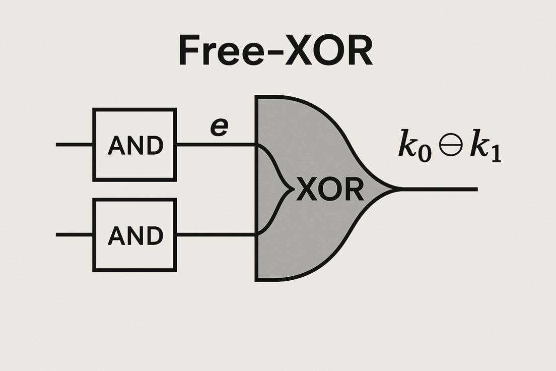 Kolesnikov 和 Schneider 引入的 Free-XOR 技术是 GC 效率史上最重要的里程碑之一。 该技术通过精巧的密钥标签结构设计,使得 XOR 门的评估可以完全免费,即不需要任何额外的加密操作或通信开销。该技术极大地降低了布尔电路的带宽和计算负担,特别适用于包含大量加法或异或操作的函数,如内存访问和部分哈希运算。Free-XOR 的优化效果显著,并随后被推广到多方协议,例如 BMR 协议。此外,通过引入半门等进一步的优化,每个 AND 门所需的加密操作被压缩到只需两个密文,实现了 GC 的进一步压缩和加速。