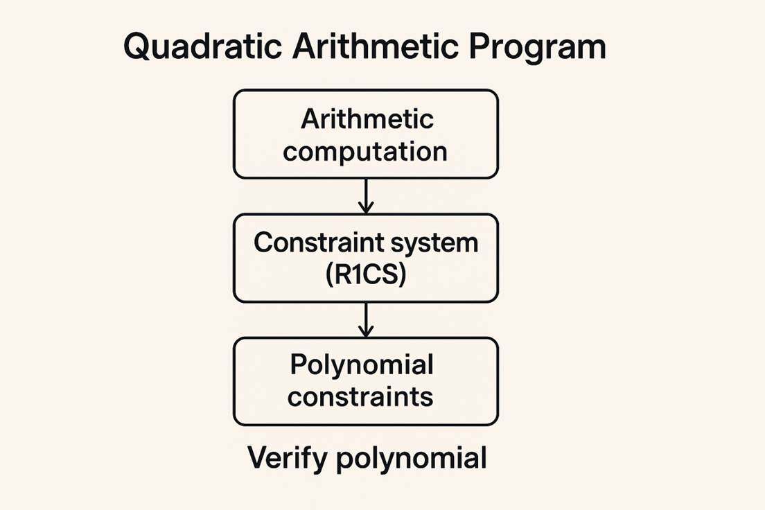 QSP 与 QAP 的目的都是将不同的计算问题转化为多项式问题,但作为 QSP 的改进版,QAP 更加简洁,更加规范,应用范围也更加广泛,故我们只会聚焦于 QAP。QAP 有一个较强的假设,即任何在确定性图灵机上可以在一定计算资源内解决的计算问题,都可以被转化为一个等价的、关于多项式整除性问题的算术电路。下面介绍 QAP 的核心流程: