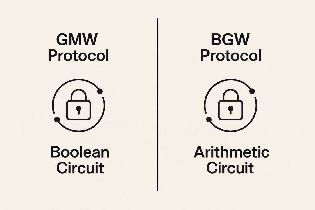 与之并列的是 BGW 协议(Ben-Or-Goldwasser-Wigderson),该协议同样基于秘密共享,但主要应用于算术电路而非布尔电路。与 GC 不同,GMW 和 BGW 协议的通信轮数通常取决于待计算函数的电路深度。这种特性使得它们在网络延迟较大的环境中,性能表现往往不如常数轮的 GC 协议。