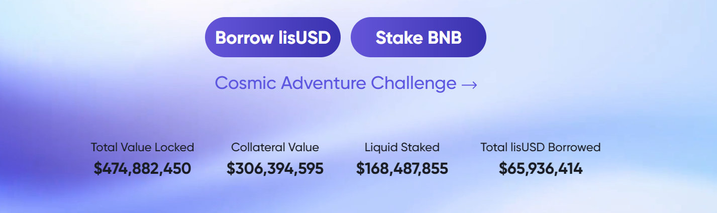 Lista DAO 是流动性质押和去中心化稳定币借贷协议。用户可以在 Lista 上进行质押和流动性质押,以及使用一系列去中心化抵押品借入 lisUSD。截止今日官网显示,Lista DAO 平台上的 TVL 总计高达 4.74 亿美元,一个月涨幅超 30%,在 BSC 链生态应用中排名第四。其中,抵押品价值超 3 亿美元,流动性质押资产价值约 1.68 亿美元。