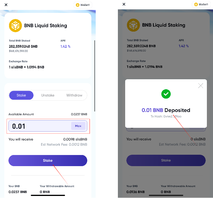STEP 4. 输入 0.01 BNB 并点击 Stake(0.01 BNB 即可),提示存入成功即可