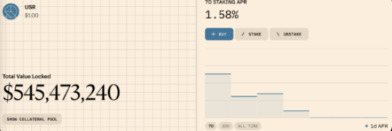 用户可以质押 USR (stUSR) 来赚取奖励,而 RLP 持有者则获得额外的基于风险的溢价。利润来自于ETH 质押奖励、期货头寸和协议费用(即时赎回的 0.05% )。如果协议发生损失,则由 RLP 持有者吸收,确保稳定币得到完全支持。