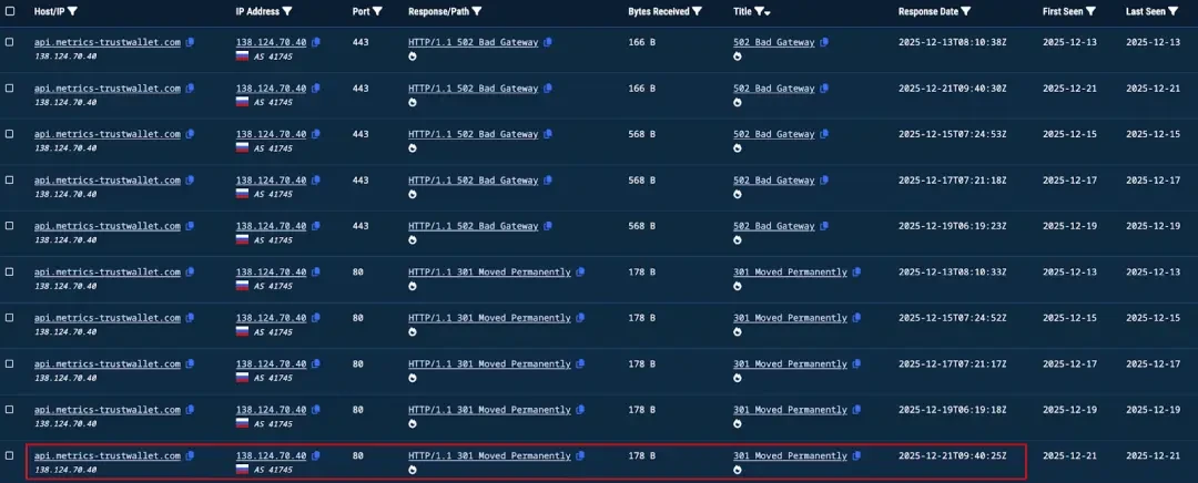 在 2025-12-21 开始有首次针对 api.metrics-trustwallet[.]com 的请求记录: