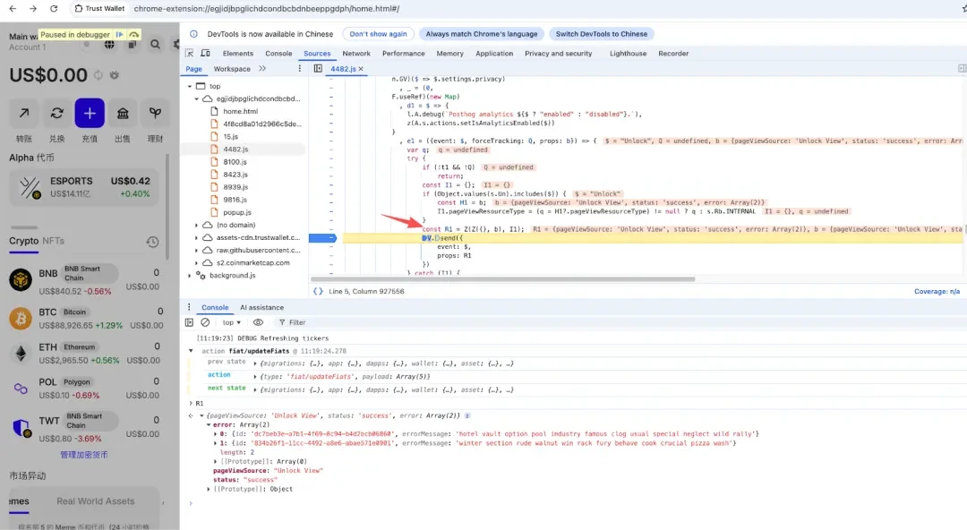 通过动态分析可以看到在解锁钱包后,可以在 R1 中看到攻击者将助记词信息填充到 error 里面。
