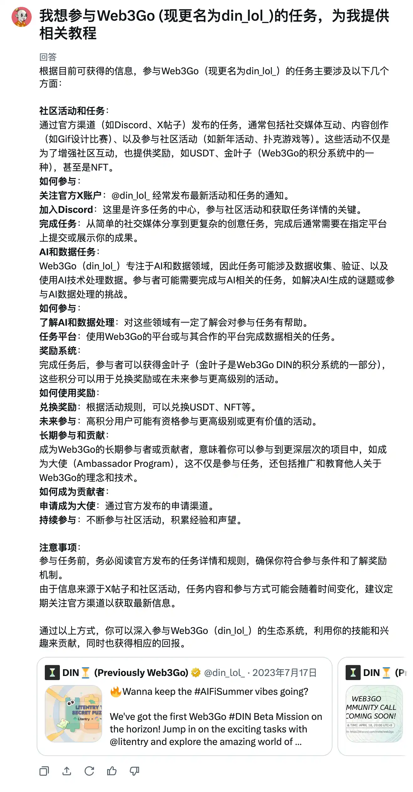除了项目调研报告,Grok 2 还能写撸毛教程。之前 Grok 2 的回答里提到 Web3Go 可以通过完成任务获取积分,直接让它提供一份详细的教程。