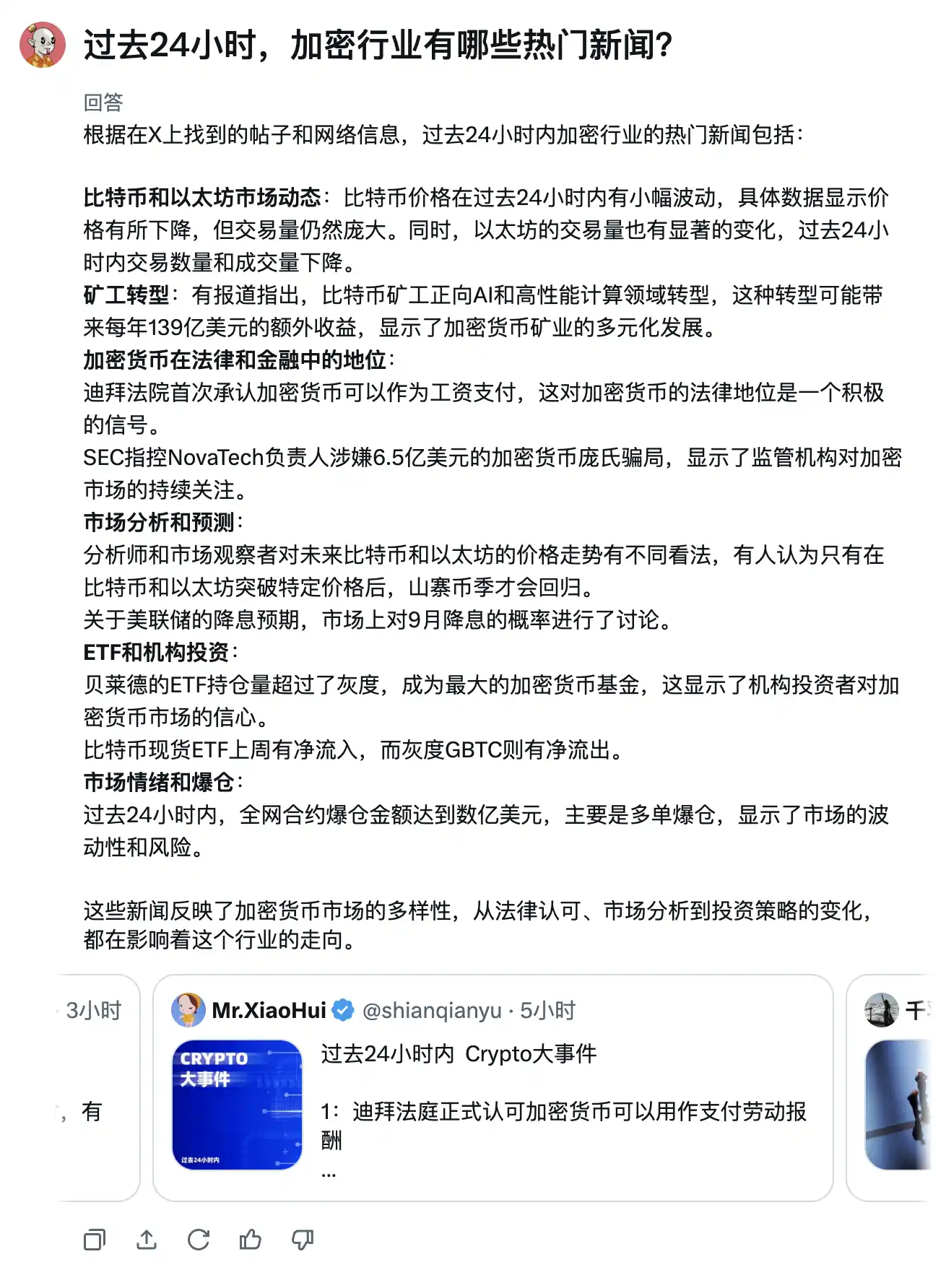 同样的事情,现在 Grok 2 也能做了。比如,你问它「过去 24 小时,加密行业有哪些热门新闻?」它就会根据推特上最相关的实时贴文为你总结一份新闻简报,并在文末附上参考来源以供验证。