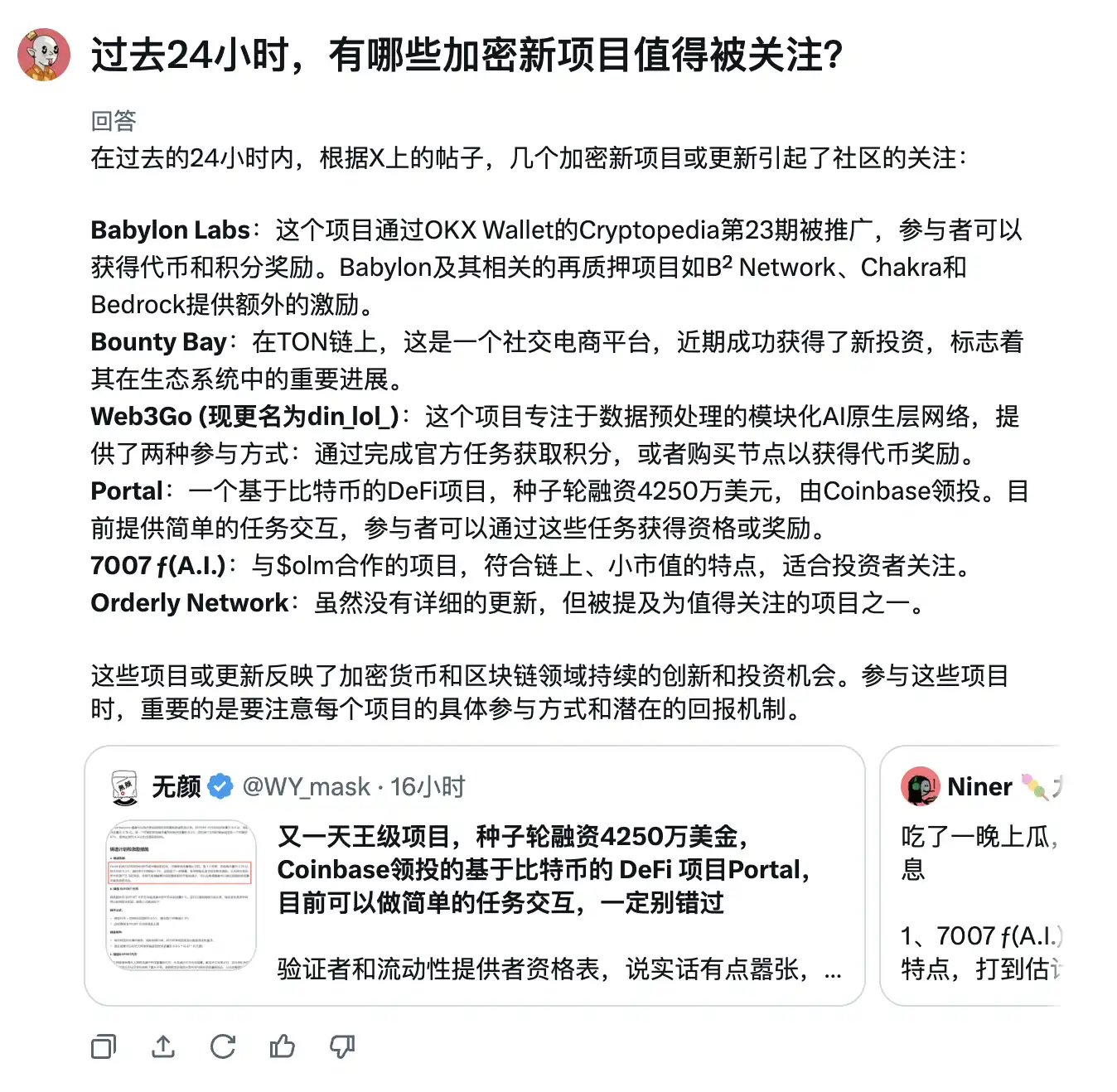 加密行业是一个很讲究信息差的行业。有些项目如果你早早了解和参与,就有可能获得远超常人的利润回报。而这个 Grok 2 也能帮上忙,比如你可以问它「过去 24 小时,有哪些加密新项目值得被关注?」它就会为你梳理出 KOL 们最近提到了哪些值得关注的新项目。