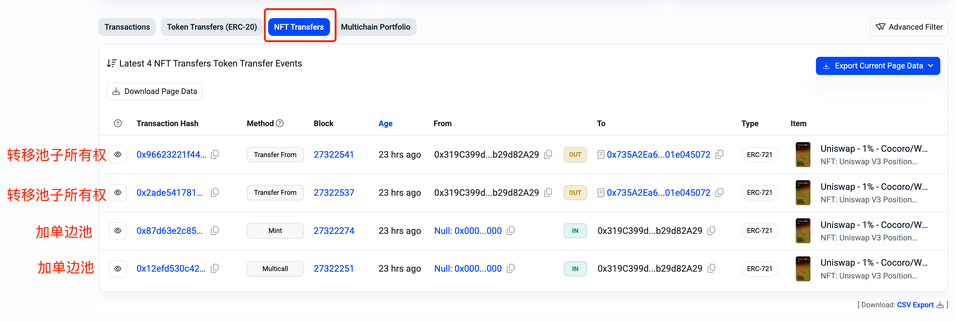 在区块浏览器中输入此地址(https://basescan.org/address/0x735a2ea69997e668dd0f4b2a30ffa9f01e045072),查看【Transactions】、【Token Transfers(ERC-20)】版块的交易,没有发现和锁池子相关的交易,说明官推中提到的锁池子目前并没有做。只看到有一笔领取手续费的操作( https://basescan.org/tx/0x316d0ea27ae38fd33b694e2bb444c5ec1567a56b7e4b403ec257d3c0ccb1a124 ),领取的手续费价值 170 万 u 左右。