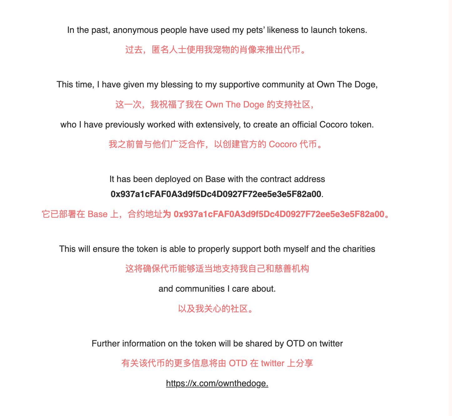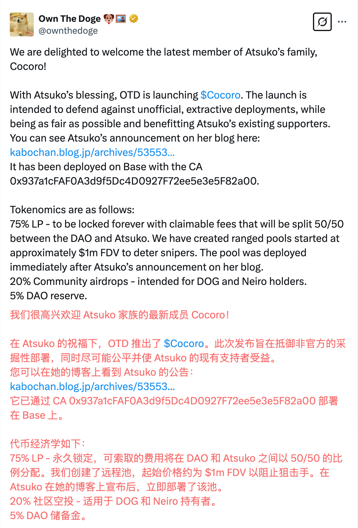 前天狗妈在博客上发了新文章( https://kabochan.blog.jp/archives/53553858.html ),收养了新的狗狗,并同 Own The Doge 社区合作,推出了官方代币$cocoro,部署在 BASE 链,合约地址为0x937a1cFAF0A3d9f5Dc4D0927F72ee5e3e5F82a00。