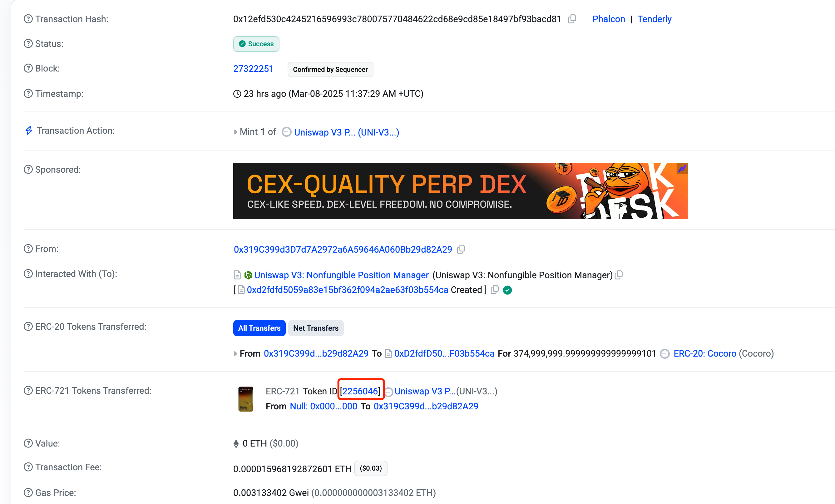 对于 a 中的两笔交易,我们任意打开一笔,查看交易详情可以获得 NFT 的 Token ID。比如打开上图中最后一笔交易( https://basescan.org/tx/0x12efd530c4245216596993c780075770484622cd68e9cd85e18497bf93bacd81 ),查看详情可知 dev 将 375 M 数量的币转移给了一个地址,但是没有转 weth,说明此处是添加的单边池,并不是双边池。在下面部分可以看到此池子对应 NFT 的 Token ID 为 2256046 ,如图。