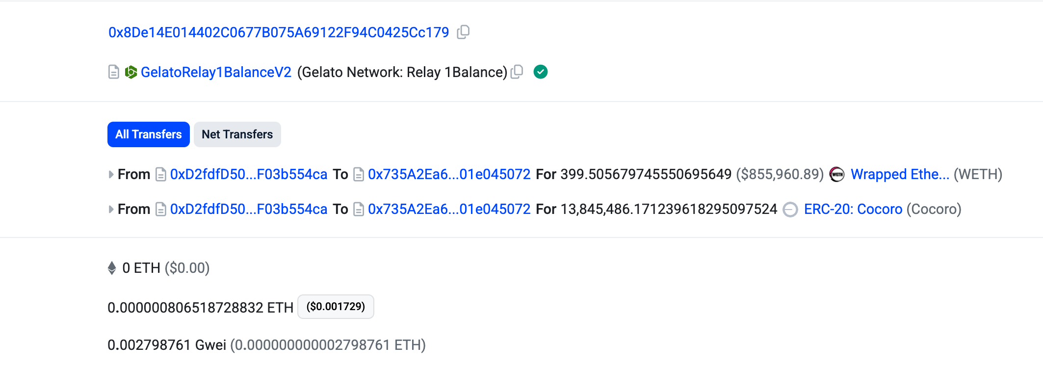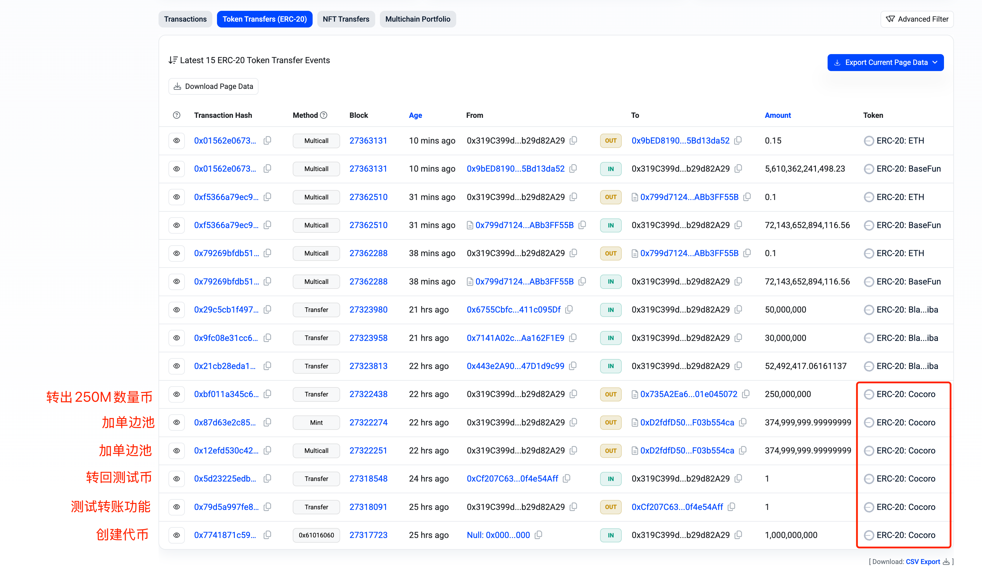 在区块浏览器中输入 dev 地址0x319C399d3D7d7A2972a6A59646A060Bb29d82A29 ( https://basescan.org/address/0x319c399d3d7d7a2972a6a59646a060bb29d82a29 ),打开【Token Transfers(ERC-20)】栏,只看【Token】列为“ERC-20: Cocoro”的交易,从下往上每笔交易依次为:
