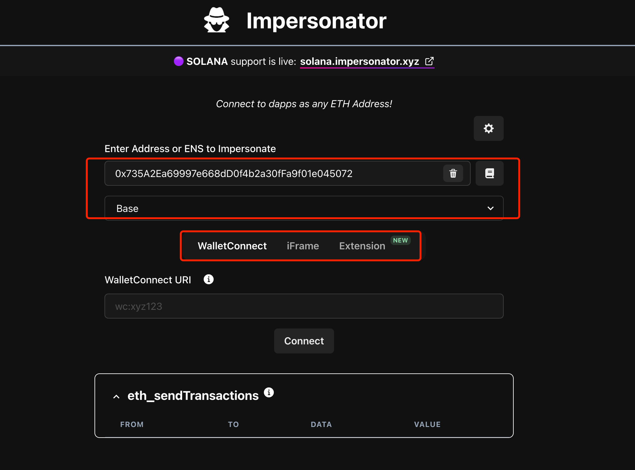 打开 impersonator 的官网 https://impersonator.xyz/,可以看到需要填钱包地址和选择链,这里钱包地址填0x735A2Ea69997e668dD0f4b2a30fFa9f01e045072,链选择“Base”,下方支持三种模拟方式“WalletConnect”、“iFrame”、“Extension”。