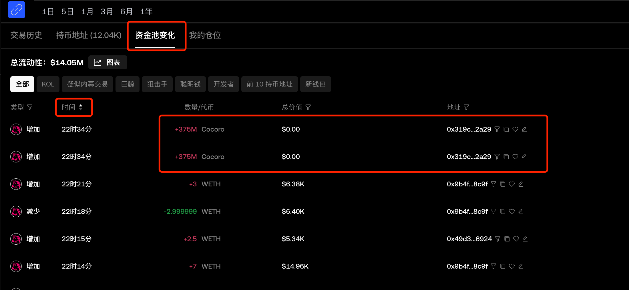我们打开 okx 网页版,输入$cocoro 的 CA ( https://www.okx.com/zh-hans/web3/detail/8453/0x937a1cfaf0a3d9f5dc4d0927f72ee5e3e5f82a00 ),在【资金池变化】栏可以看到所有的加池子和减池子操作,对【时间】按正序排列,可以看到最早的两笔加池子操作,分别各加了 375 M 的$cocoro 单边池,这两笔交易的数量正好是 75% ,和代币经济学中描述一致。
