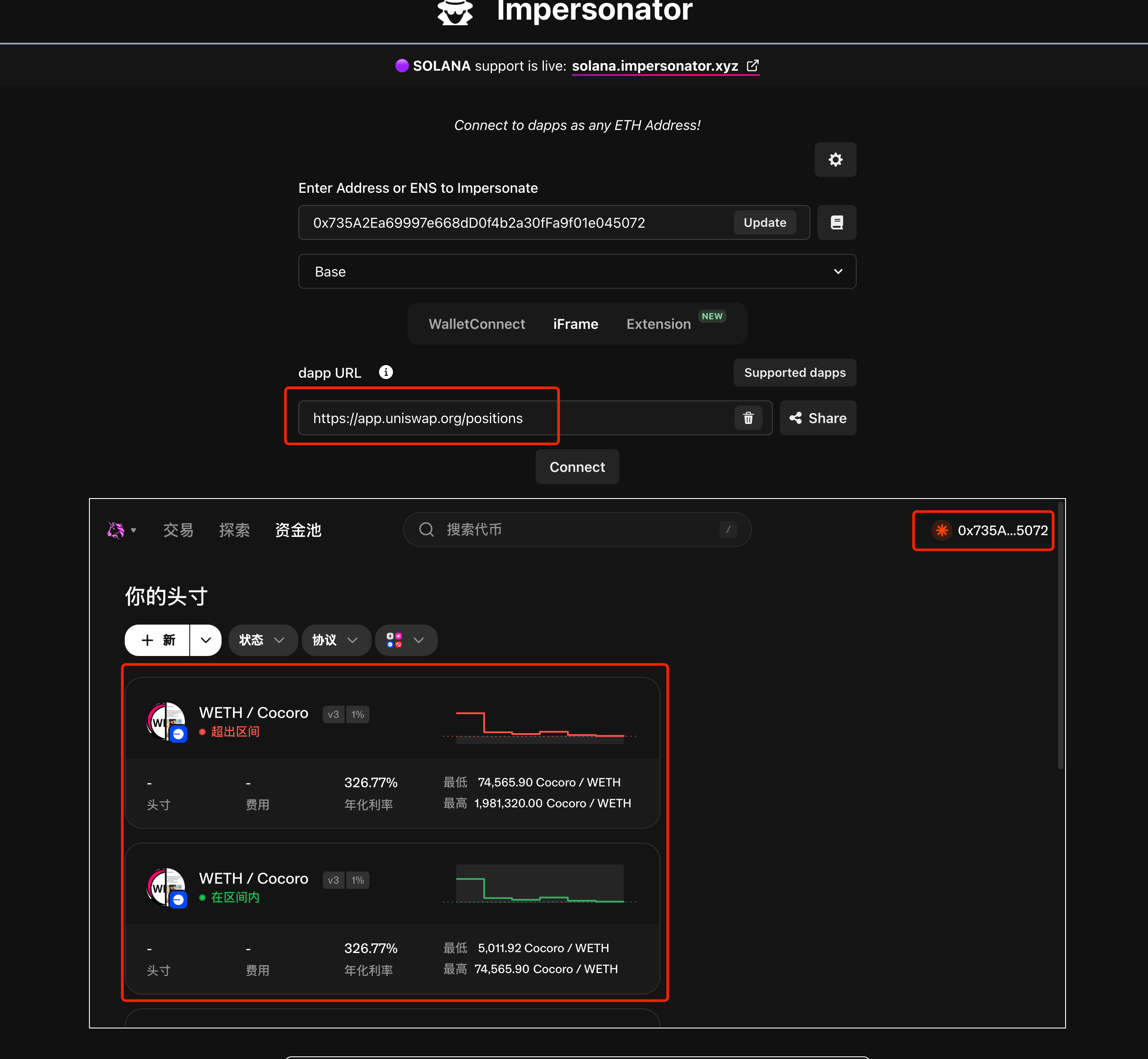 impersonator 目前也支持 solana 链钱包的模拟登录 dapps,不过目前只支持 WalletConnect 方式。我们在之前的文章《手把手教学:快速掌握 Meteora 流动性性价格区间的查看方法》第二章选择用观察钱包查看,此时就可以利用 impersonator 进行模拟登录。不过遗憾的是 Meteora 目前暂时不支持 WalletConnect 方式连接钱包。