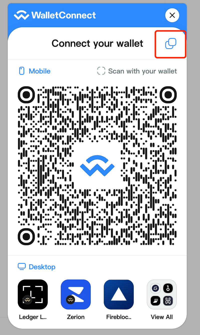 在出现的 WalletConnect 二维码页面中点击复制,然后将内容粘贴到 impersonator 网站中的“WalletConnect URI”处,此时 Uniswap 网站就会连接到上面输入的地址,此时即可查看池子信息。