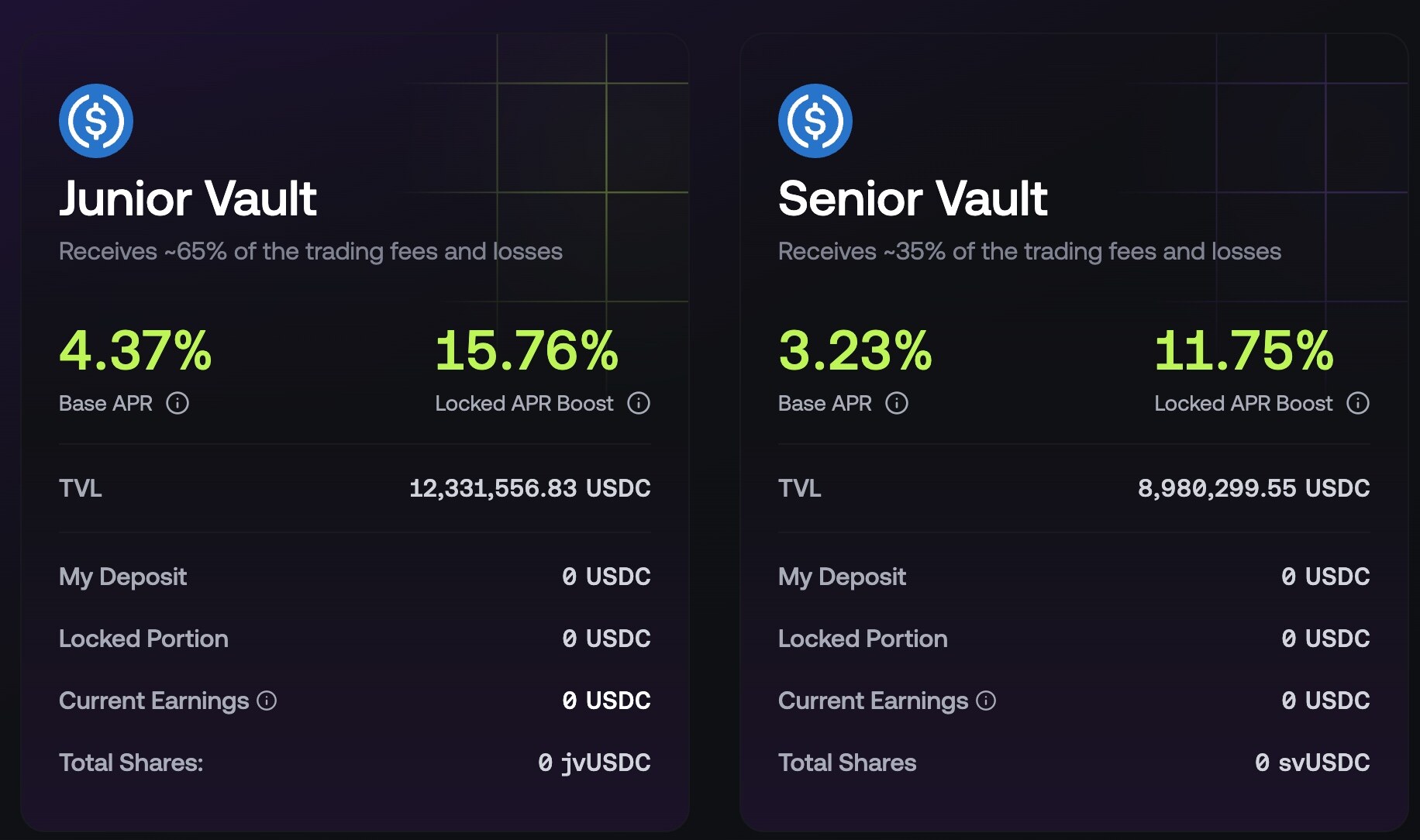 除去积分对应的潜在空投收益外,Avantis LP 本身的收益率也相对可观。Avantis 的 LP 分为高风险和低风险两种,高风险承担更高的做市损失(65%),但也可获得更高的手续费收入(35%);低风险承担更低的做市损失(65%),但手续费收入也更低(35%)。目前选择高风险 Vault 的基础收益为 4.37% APR,锁仓 LP 的话最高可放大至 15.76%;选择低风险 Vault 的基础收益为 3.23% APR,锁仓 LP 的话最高可放大至 11.75%。