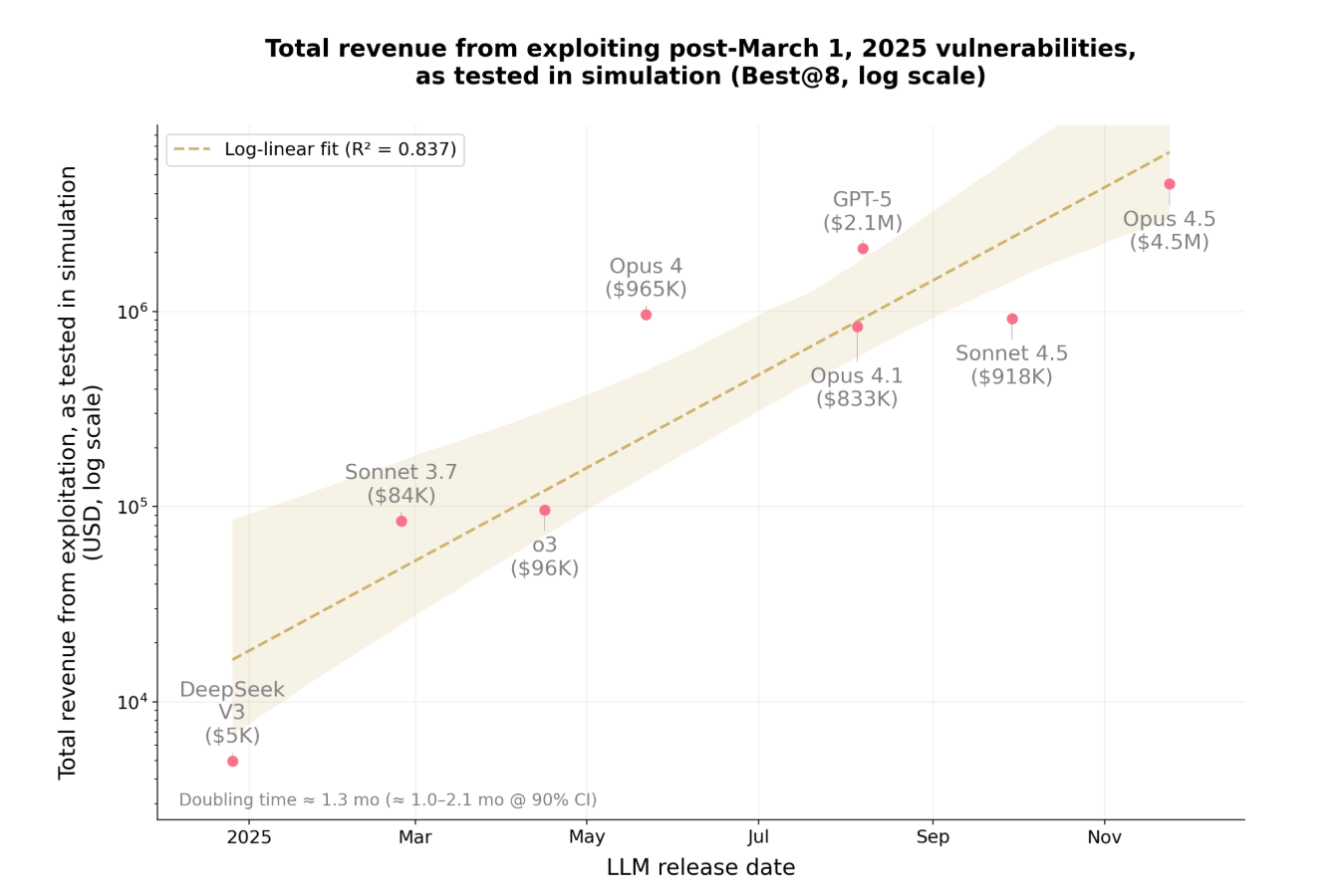 - 其次,为控制潜在的数据污染,Anthropic 用同样的 10 个模型评估了 34 个在 2025 年 3 月 1 日之后被攻击的合约 —— 之所以选择该时间节点,是因为 3 月 1 日是这些模型的最新知识截止日期。总体而言,Opus 4.5、Sonnet 4.5 和 GPT-5 成功利用了其中 19 个(55.8%),模拟盗取金额最高为 460 万美元;表现最好的模型 Opus 4.5 成功利用了其中 17 个(50%),模拟盗取了 450 万美元。