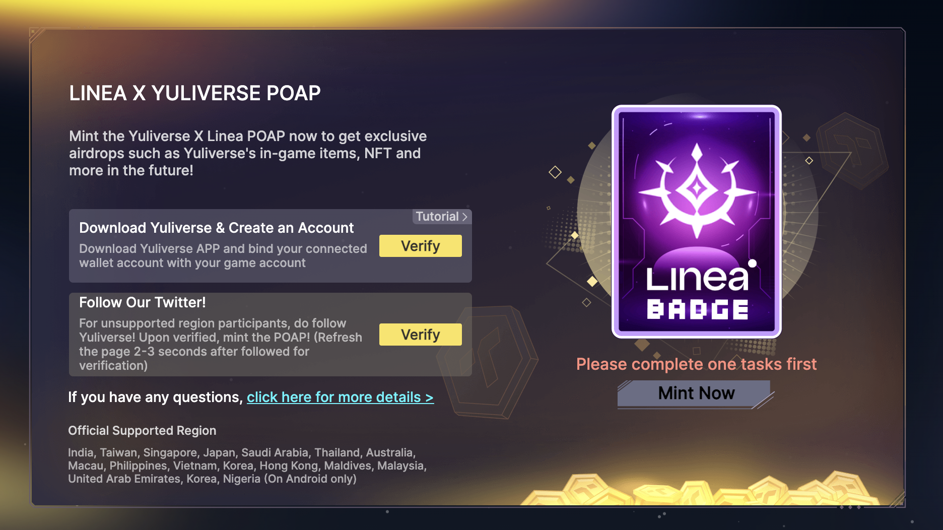 通过下载 APP,根据指引完成新用户注册,并且关注官方推特完成验证后,Mint 一个 NFT 即可。