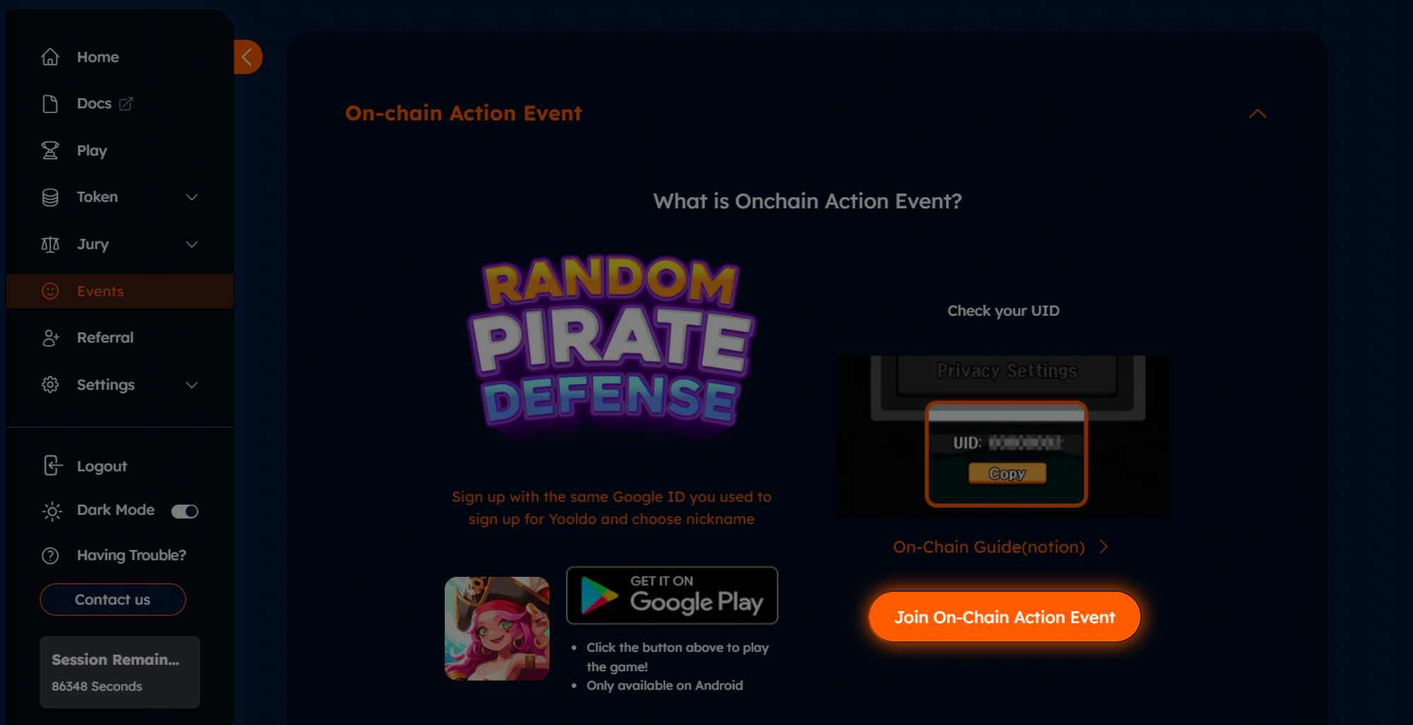 第五步,回到网页端,点击[Join On-Chain Action Event] 按键,将复制的 UID 填写进去,每个 UID 可以 Mint 一个 NFT。