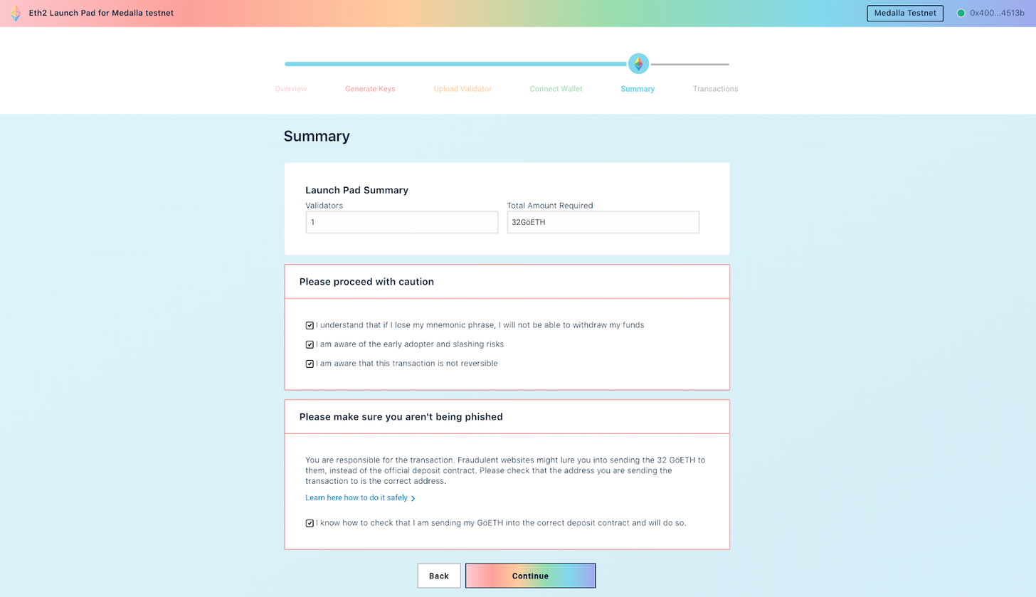研究结果就是Eth2 Launch Pad,该应用可以让用户安全地完成以下步骤:生成Eth2密钥对,在Eth2测试网和主网上的正式存款合约里质押32个ETH。