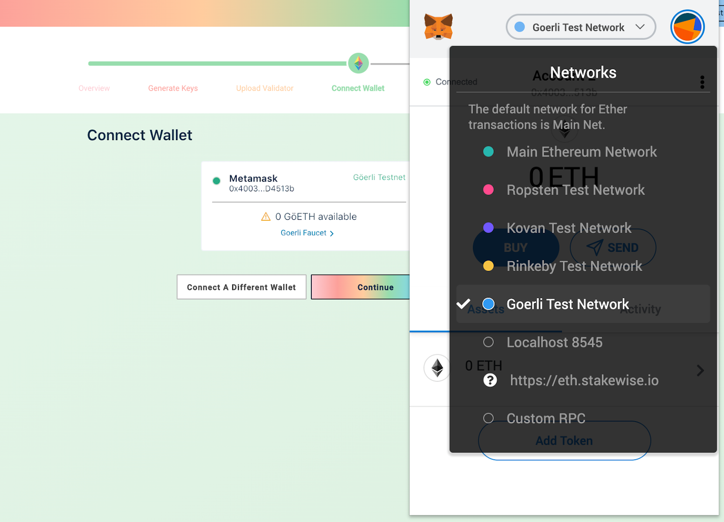 下一步是连接你的Web3钱包并点击继续。确保在钱包设置中选择了Goerli测试网。
