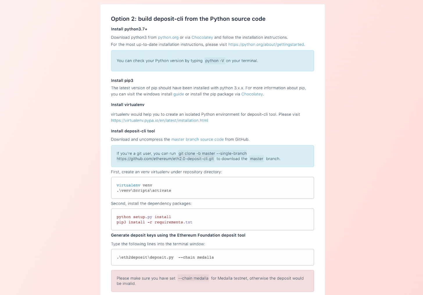 第二种选择是从Python源代码中构建deposit-CLI工具。参与者需要按照以下说明操作,以确保安装了所有必需的开发库和deposit-CLI工具。