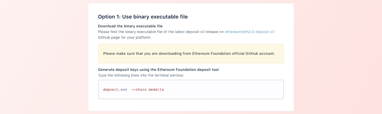 第一种选择是使用从ethereum/eth2.0-deposit-cli页面下载的二进制可执行文件,在自己的终端运行./deposit指令。