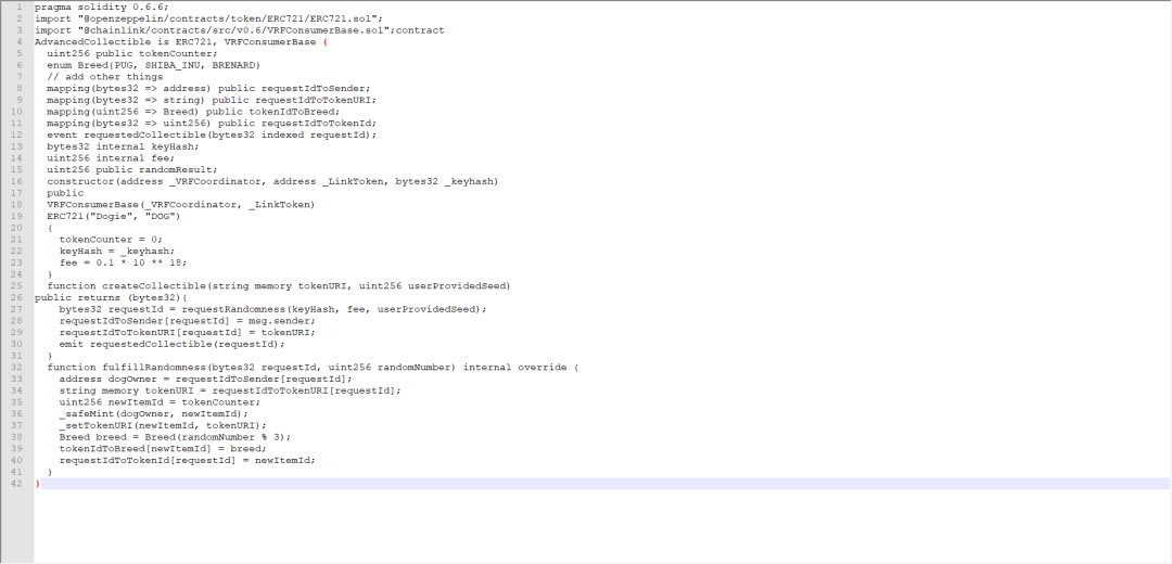 在这个 NFT 合约中,我们使用 Chainlink VRF 来给我们的 NFT 提供随机状态。在这种情况下,我们正在使用随机性来给我们的狗一个随机的品种。当我们这次调用 createCollectible 时,我们实际上是向 Chainlink Oracle 发送了一个请求,以返回一个经过加密证明的随机数。这样,就不会有任何可能破坏游戏公平性的“暗箱操作”行为发生。这个请求是异步的,我们必须等待 Chainlink oracle 用随机数进行第二次交易。
