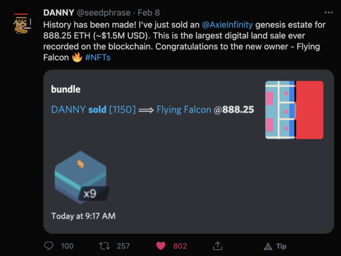 首先要明确的是,NFT 具有无限的潜力。今年2月,Axie Infinity以888.25 ETH 的价格出售了9块地。(目前价值约 391 万美元 )