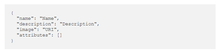 作为一种变通方法,大多数 NFT 都有一个所谓的 tokenURI 。这是一个全球唯一的标识符,用于 NFT 的可视性领域。这使得给 NFT 添加视觉效果更容易。URI 是一个统一资源标识符,它可能是一个 HTTPS API 调用,通过 IPFS 的东西,或其他类型的唯一标识符。这个元数据看起来像这样。