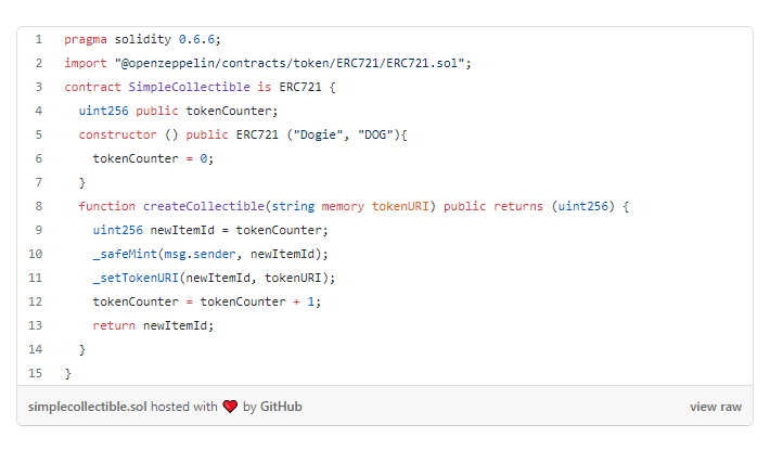 我们创建一个带有 DOG 符号的代币,名字是 Dogie 。然后我们可以用 createCollectible 函数来铸造我们想要的 DOG ,每次都会给我们存储一个新的 tokenId 。我们需要做的就是传递一个 tokenURI ,它只是任何指向元数据 JSON 格式的东西的 URL/URI 。